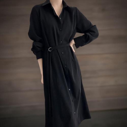 [옷자락]여성 가을 하객 출근용 벨트 셔츠 롱 원피스
