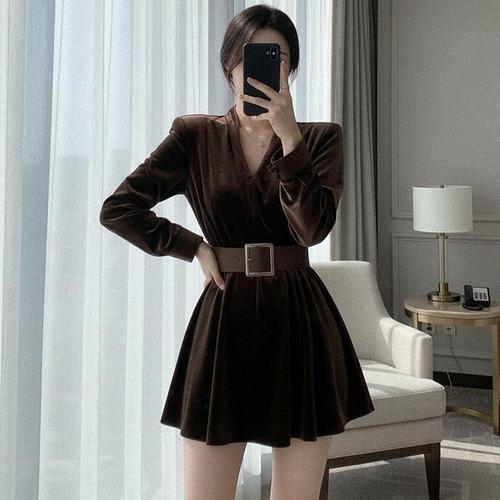 여자 벨벳 브이넥 벨트세트 롱슬리브 원피스