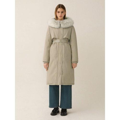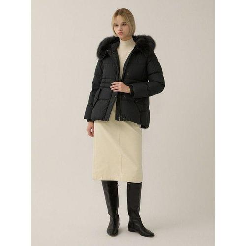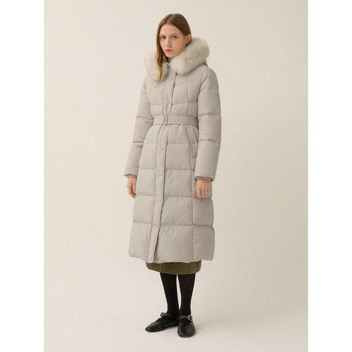 샤틴 벨티드 폭스퍼후드넥 덕다운 롱패딩