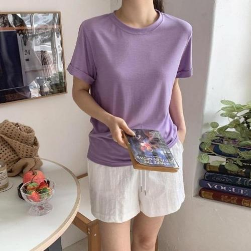 [다잇템][다잇템] 여자 소프트핏 편한 보라색 롤업반팔티 라운드 티셔츠_21449360_588872