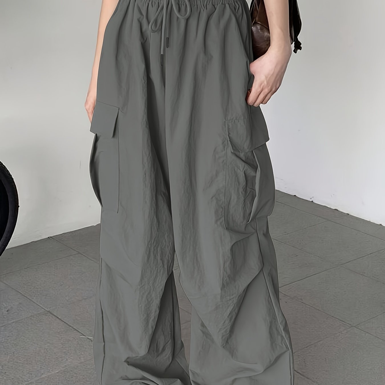 TEMU 여성용 올리브 그린 카고 팬츠 - 와이드 레그 다용도 포켓, 벨트리스 드로스트링 허리 & 사계절 루즈핏 (논스트레치) 아웃도어, 여행용 캐주얼 팬츠