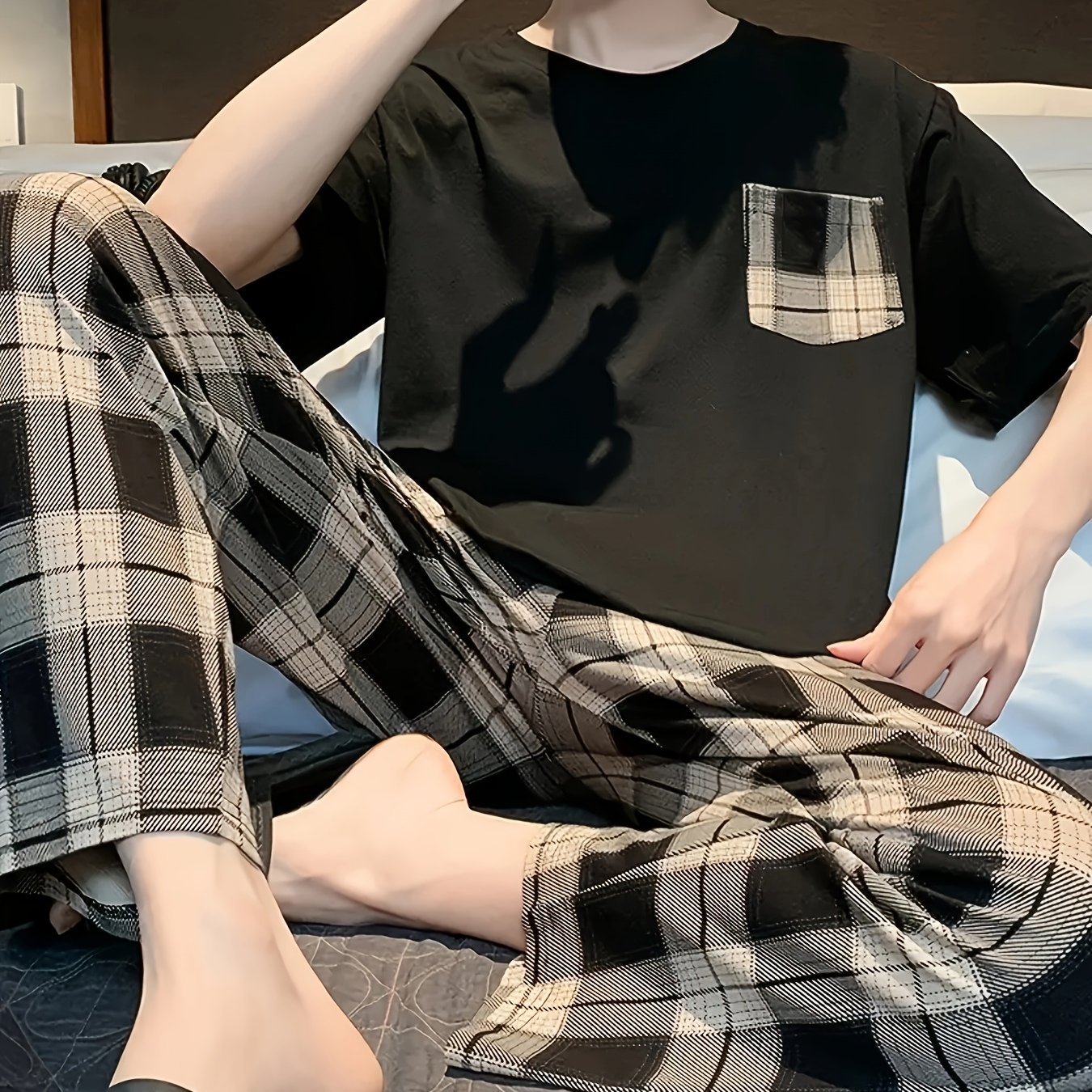 TEMU 남성용 2피스 우아한 캐주얼 파자마 세트 - 심플 체크 포켓 반팔 및 체크 팬츠 - 사계절용 편안함, 레귤러 핏, 크루 넥, 기하학 패턴, 캐주얼 의상에 완벽, 편안한 라운지웨어 | 편안한 핏 파자마 | 부드러운 원단 바지, 남성용 파자마