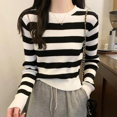 여성 봄가을 겨울 DIA 다이아몬드 레트로 콘트라스트 라운드넥 니트티 3칼라 /3