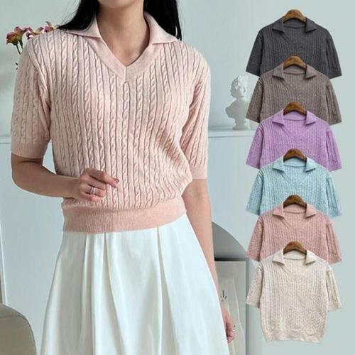[에이치플러스몰]봄 베이직 니트티 카라넥 캐쥬얼 티셔츠 롱니트 티