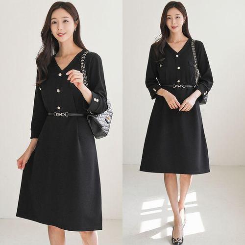 비비디아 여성 봄 가을 클래식 카라넥 금장버튼 플레어핏 하객룩 오피스룩 원피스 데일리룩(벨트포함)5573