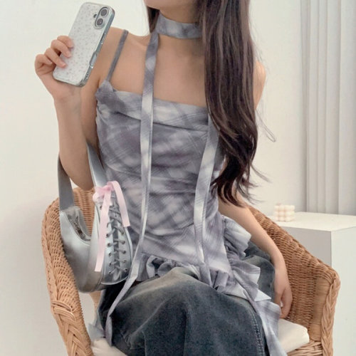 입꼬 / 미유 체크 언발 사선 프릴 레이어드 뷔스티에