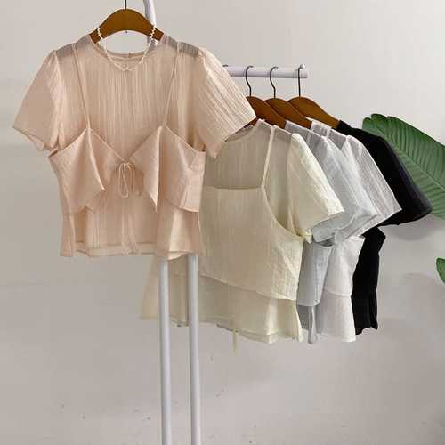 [에이치플러스몰]시스루 뷔스티에 세트 잔주름 3컬러 얇은 퍼프 블라우스 여자