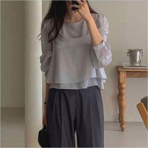 떳다그녀 앤스롤 뷔스티에 레이어드 일체형 오간자 라운드넥 봄 가을 간절기 블라우스