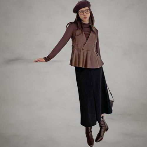 [옷자락] 여성 키치무드 긴팔 티셔츠 레더 브이넥 뷔스티에 세트