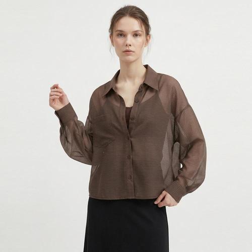 헤지스 여성 26SS 서커 스트라이프 7부 셔츠 브라운 HSSH6B304W2