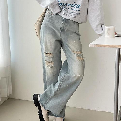 [기타브랜드]여자 워싱 데미지 데님 팬츠 트렌디한 포인트의 캐주얼룩 청바지