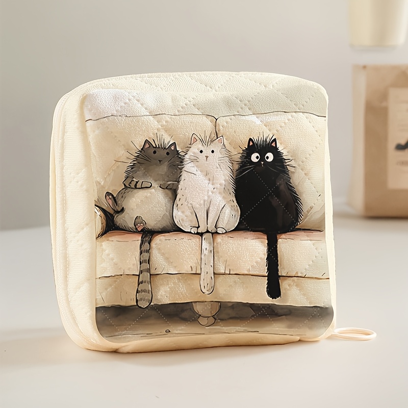 TEMU 헤드폰 및 소형 액세서리에 적합한 작은 고양이 패턴 프린트 그리드 휴대용 대용량 생리대 보관 가방, 지퍼로 닫힐 수 있는 여성 제품 보관 가방