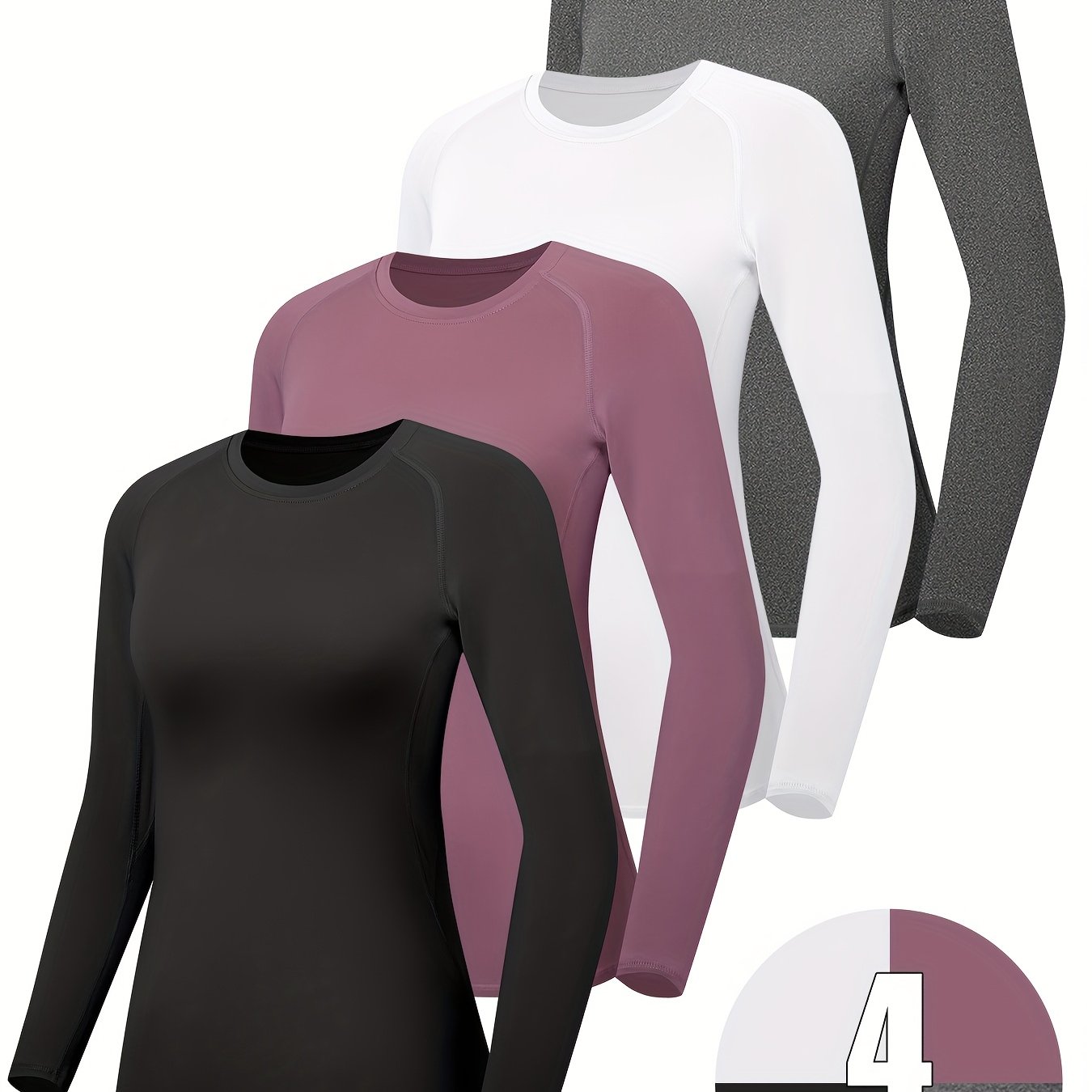 TEMU 여성용 압축 티셔츠 4개 세트, 솔리드 컬러 롱 슬리브 운동 베이스 레이어 운동복 상의, 여성용 액티브웨어