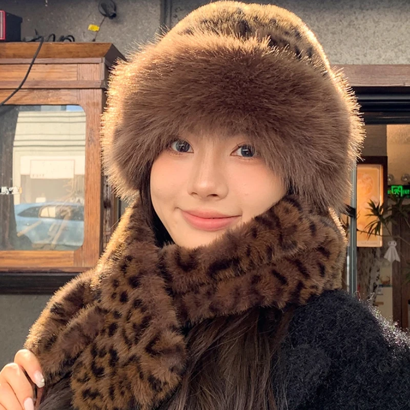 레트로 레오파드 프린트 플러시 분지 모자 여성 가을, 겨울 스카프, 내한성 및 따뜻함, 모조 모피 몽골 모자 스카프