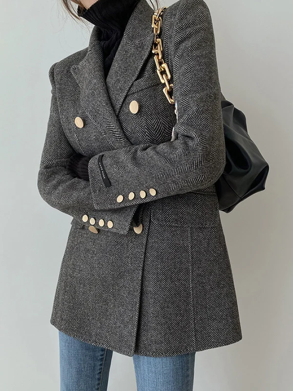 우아한 울 코트 여성용 한국 스타일 가을 롱 슬림핏 체크무늬 수트 더블 버튼 폴리에스터 섬유