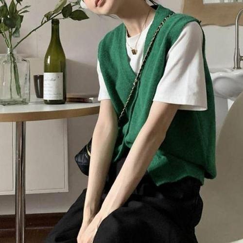 유미 여자 루즈핏 니트 조끼 봄 가을 겨울 캐주얼 조끼 브이넥 면 조끼
