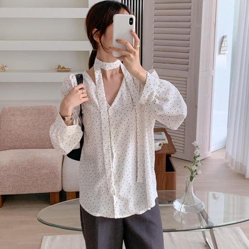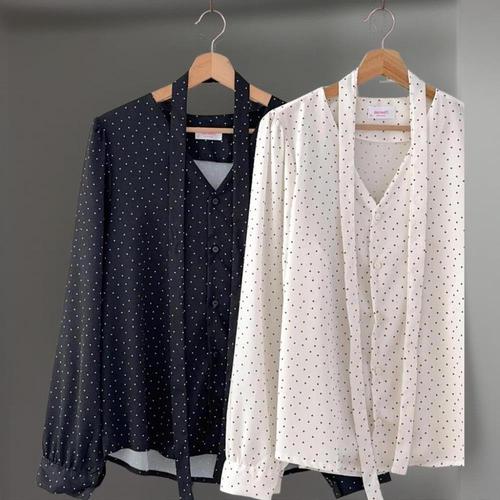 [신상오픈런]여성 브이넥 도트 패턴 롱타입 빅사이즈 여리핏 블라우스
