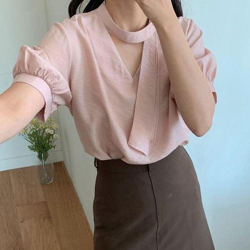 [옷자락]여자 분홍 퍼프반팔 브이넥 버튼 롱타이 블라우스