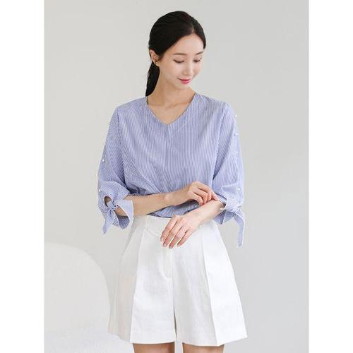 [드리다]여성 브이넥 스트라이프 진주 리본 7부 롱 블라우스 하객 모임 오피스룩 미시 엄마옷