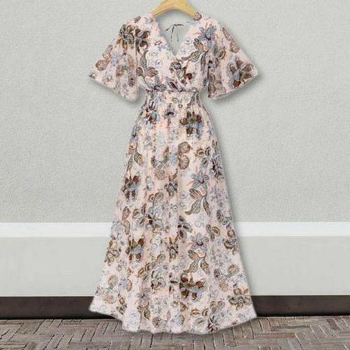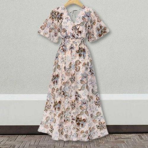 [에이치플러스몰]롱원피스 플라워패턴 캐주얼 허리밴딩 브이넥 필수템