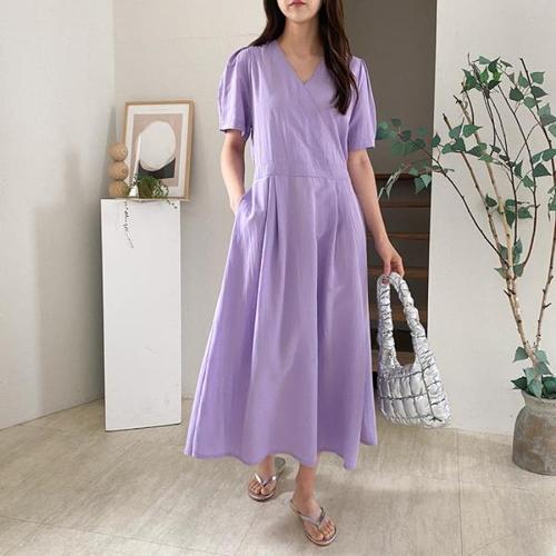 [옷자락]여자 V넥 벌룬 소매 핀턱 롱 랩 반소매 허리 원피스