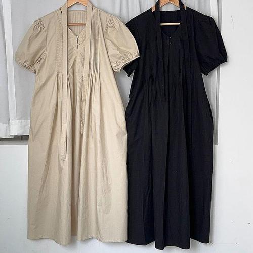 와이엔이 루즈핏 핀턱 브이넥 퍼프 소매 원피스 러블리 롱 원피스