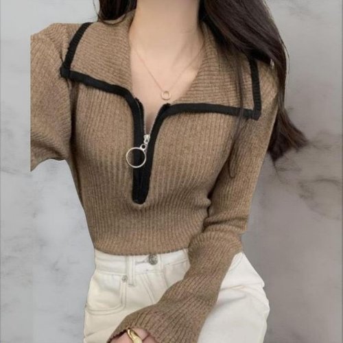 [옷자락]여성 넥카라 라인 블랙 포인트 반지퍼 골지 니트