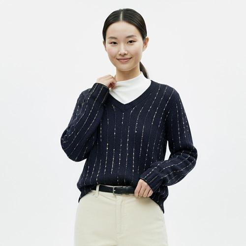 [샵앤][샵앤] 여성 V넥 블링 스트라이프 스티치 긴팔 니트 티셔츠 RBE-WKN-20872-네이비