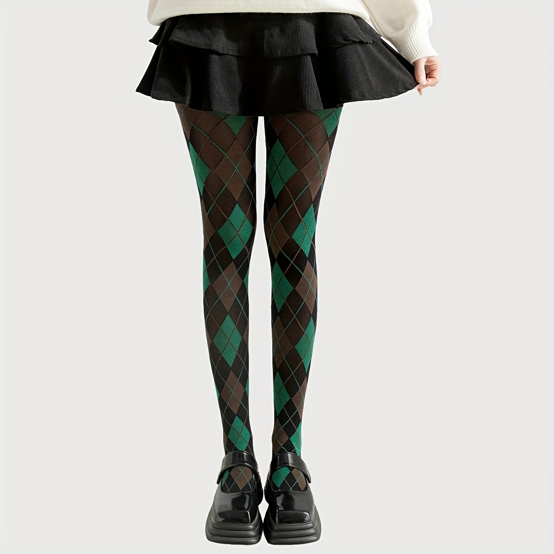 TEMU 여성용 레트로 기하학 패턴 타이츠 - 다크 그린 & 레드, 하이웨이스트, 신축성 있고 편안한 캐주얼 또는 스타일리시한 의상에 완벽한 하이웨이스트 타이츠