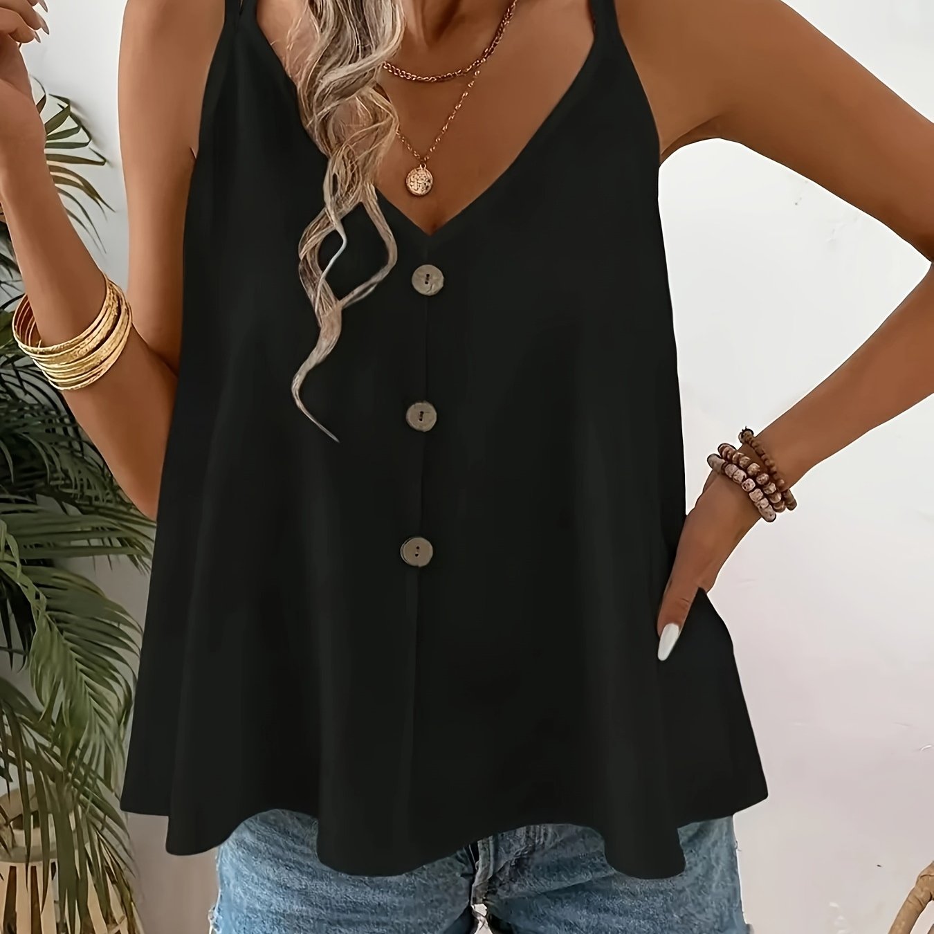 TEMU 우아한 블랙 V넥 캐미솔, 장식 버튼 - 민소매 캐미 탑