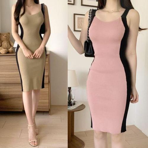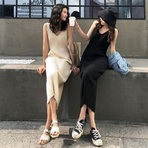 [에이치플러스몰]나시 롱 원피스 여성 브이넥 슬림핏 니트 라인 스커트