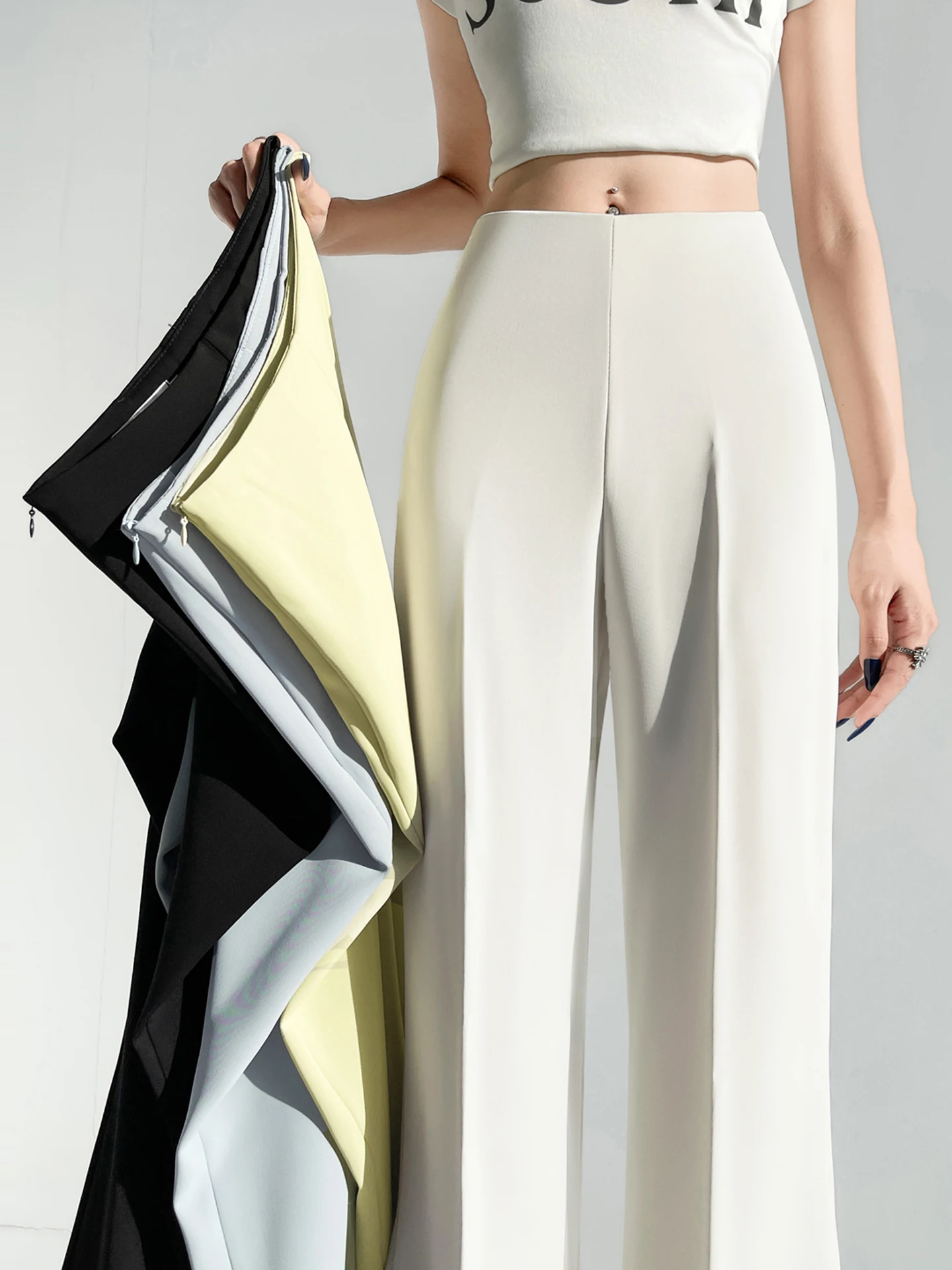 아이스 실크 와이드 레그 팬츠 여성 여름 얇은 캐주얼 하이웨이스트 슬림 롱 드레이프 마이크로 플레어 팬츠 출퇴근 스타일 한국 패션