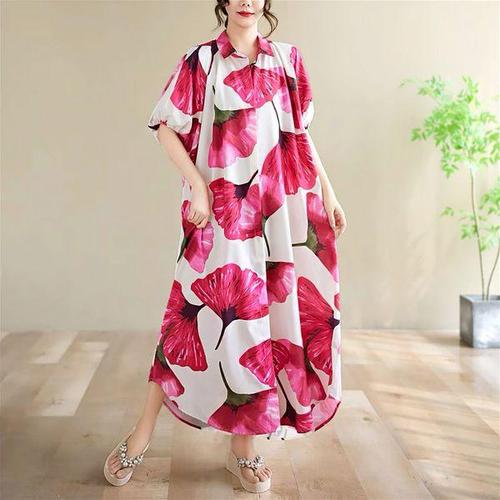 [헬리꽁땡](55~88)빅사이즈 여름 플라워카라원피스 여성 긴팔 카라 셔츠 롱 남방 원피스 박시 루즈핏