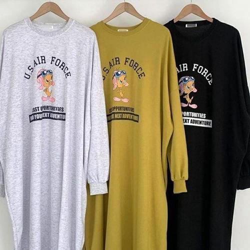[유야]캐주얼 면 무지 라운드 긴팔 플레어 미니 원피스 키작녀원피스 롱티 -OP0412H- 빅사이즈 루즈핏 여..