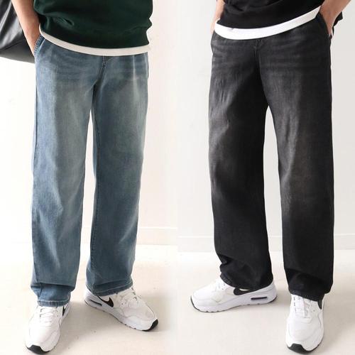 1+1 남성 데님 팬츠 가을 겨울 빅사이즈 스판 일자 남자 바지 캐주얼 루즈핏 기모 도톰 청바지 SJS