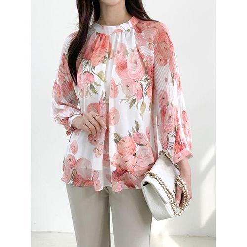 [드리다]여성 봄 플라워 플리츠 빅사이즈 쉬폰 블라우스 40-50대 미시 엄마옷 중년 하객 모임 오피스룩