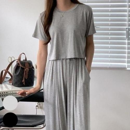 [유야]면 무지 세미크롭 반팔티 와이드팬츠 트레이닝 세트 츄리닝 투피스 셋업 -PST0342H- 빅사이즈 루즈..