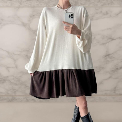 [옷자락] 여성 투톤 빅사이즈 골지 프릴 퍼프 가을 미니 드레스