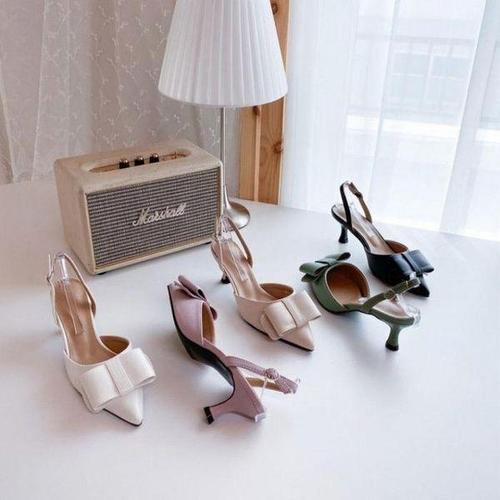 [셀러허브_여성트랜드패션]뾰족코 스틸레토힐 빅리본 슬링백 미들힐 스트랩