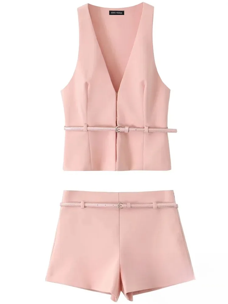 콘달라 빈티지 시크 솔리드 여성 정장 V넥 민소매 벨트 조끼 블레이저 스트레이트 반바지 뉴 패션 2025 여름 오피스 세트