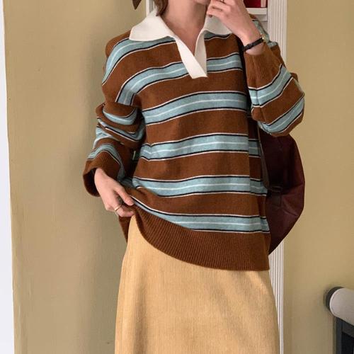 [다잇템]여자 줄무늬 FW 럭비티 빨간 콘트라스트 니트