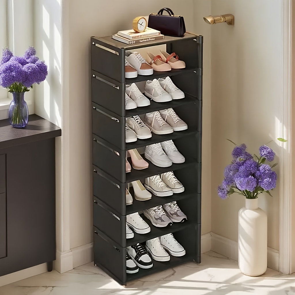 TEMU 공간 절약형 8단 넓은 검은색 신발장, 7칸 구획 - 쉬운 조립, 내구성 있는 금속 신발 캐비닛, 현관 및 거실용, 견고한 바닥 스탠딩 디자인, 완벽한 휴일 선물, 신발 보관 정리대, 슬림 신발 캐비닛