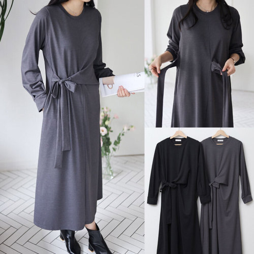 옷자락 / 여성 가을 하객 패션 사이드 컬러 배색 리본 긴팔 롱