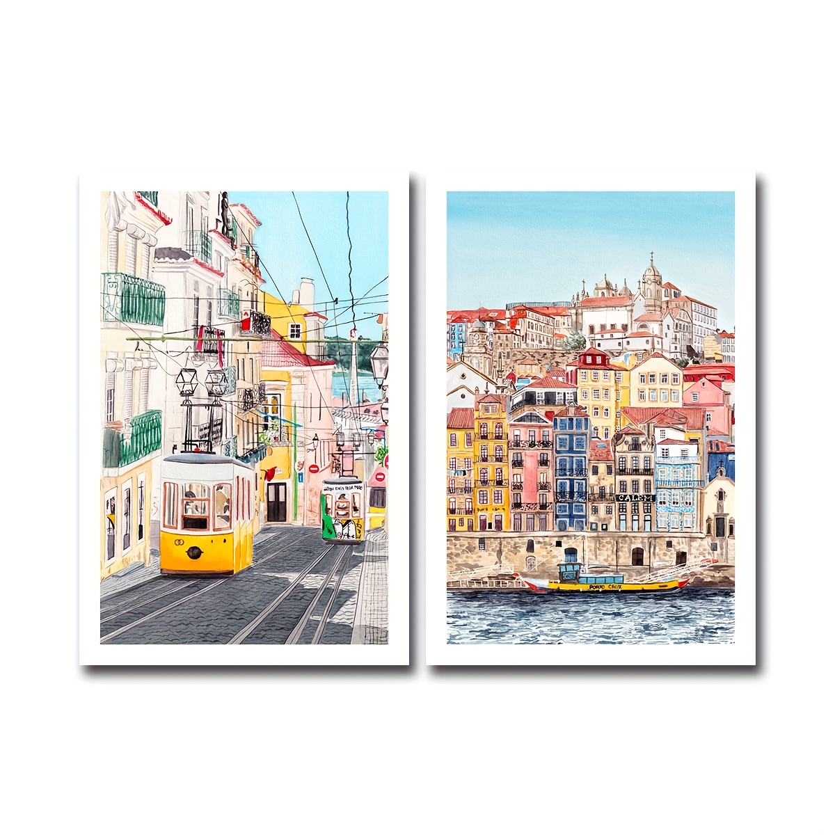 TEMU 2D 플랫, 2D 플랫, 포르투갈 도시 풍경을 그린 수채화 그림 2점 세트 (리스본 프린트 및 포르토 아트 프린트 포함), 유럽의 벽 장식, 현대적인 여행 아트, 집들이 선물로 완벽, 액자 없음
