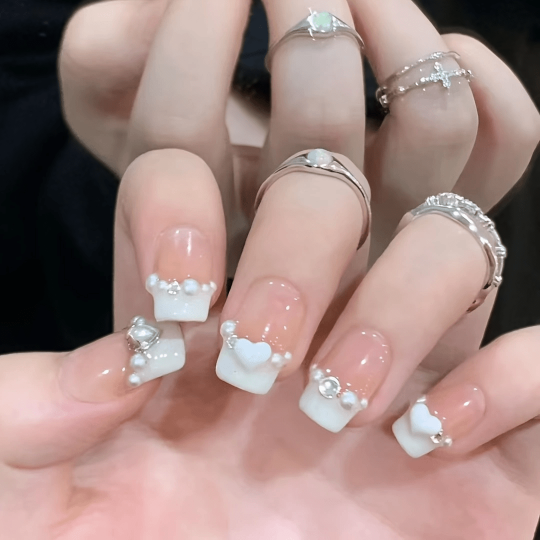 TEMU 24개 짧은 사각형 라인스톤 화이트 하트 광택 프레스온 네일 - 일본 & 한국 스타일 손발용 네일, 일상 및 특별한 날을 위한 쉬운 적용 네일 아트 스티커, 패션 액세서리, 장식 프레슨, 내구성 있는 핸드&풋 , 뷰티 애호가를 위한 매니큐어