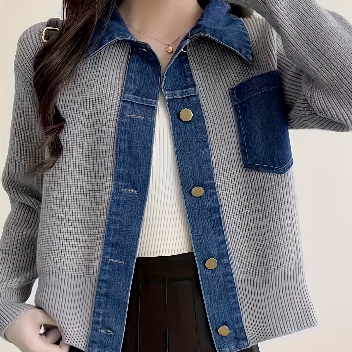 TEMU 여성용 니치 디자인 패치워크 데님 스웨터 재킷, 2025년 신상 겨울 컬렉션, 스타일리시하고 따뜻한 가디건, 빈티지 데님 패치워크 봄/가을 아우터, 소형 여성용 숏 폴로 칼라 재킷