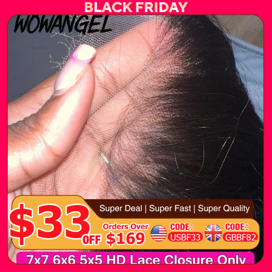 와우 엔젤 7x7 6x6 5x5 HD 레이스 클로저 정면 인모 스트레이트 헤어 멜트 스킨, 사전 발모 HD 레이스 클로저 버진 헤어