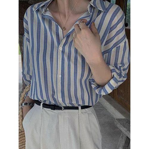 [에이치플러스몰]세로 셔츠 남방 청량한 베이직 여자 오피스룩 스트라이프