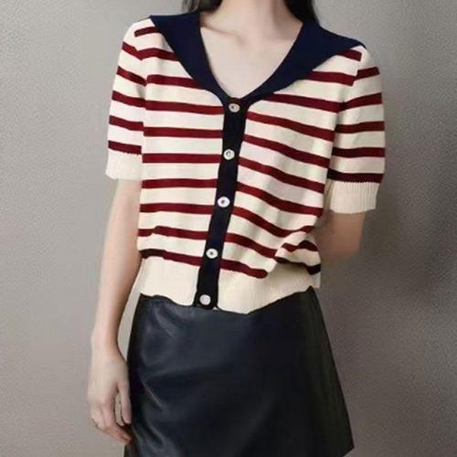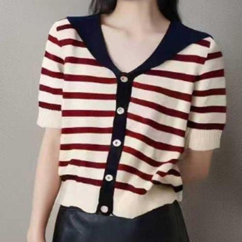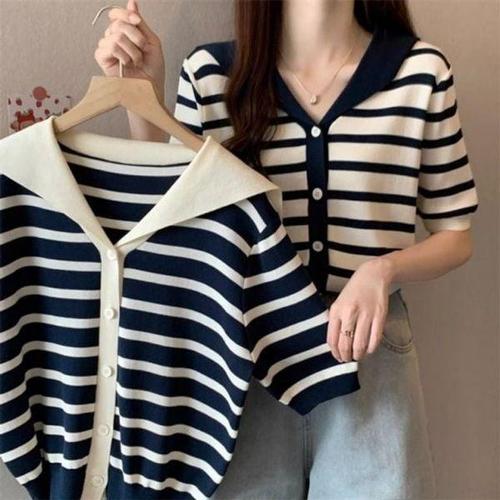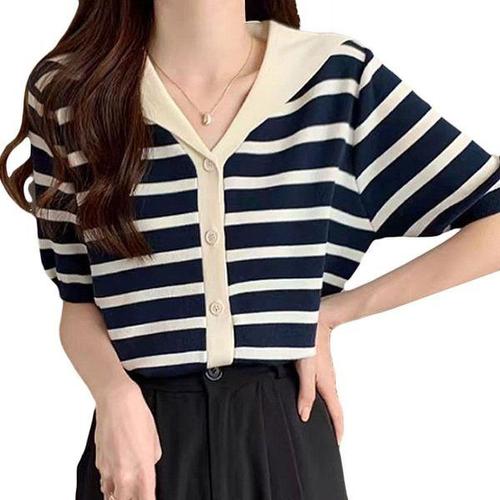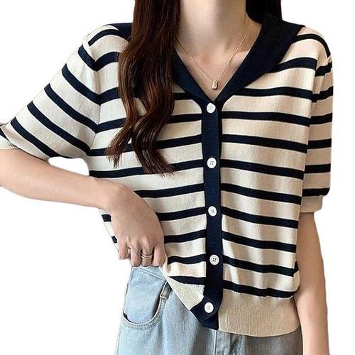 [모노무드]모노무드 여름 가디건 세일러카라 스트라이프 반팔 니트 옷 여성용