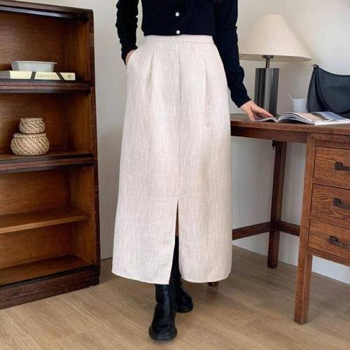 [에이치플러스몰]앞트임 트위드 새틴스커트 플레어스커트 롱 롱스